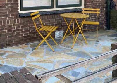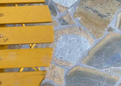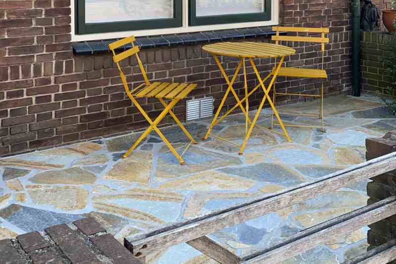 We hebben zo’n 50m2 Yellow Sikis Flagstones gelegd en een lichtgrijze voeg aangebracht. Deze zorgt voor een mooie, strakke afwerking.